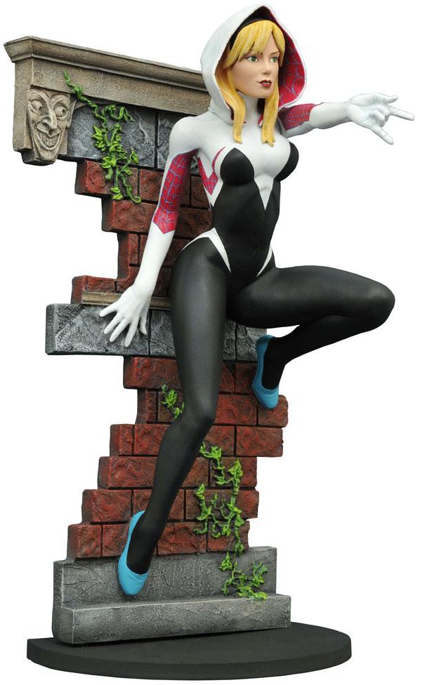 One of the most exciting new characters in the Marvel Universe is now part of one of its most exciting new collectible lines! The Amazing Spider-Gwen, a spider-powered, hard-rocking Gwen Stacy from a parallel universe, gets the Gallery treatment with this 9-inch scale static PVC figure! Posed on the side of a New York brownstone, Spider-Gwen is sculpted with a high level of detail and exacting paint applications. Packaged in a full-color window box, she is in scale to other Gallery and Femme Fatales PVC figures. Sculpted by Alejandro Pereira!