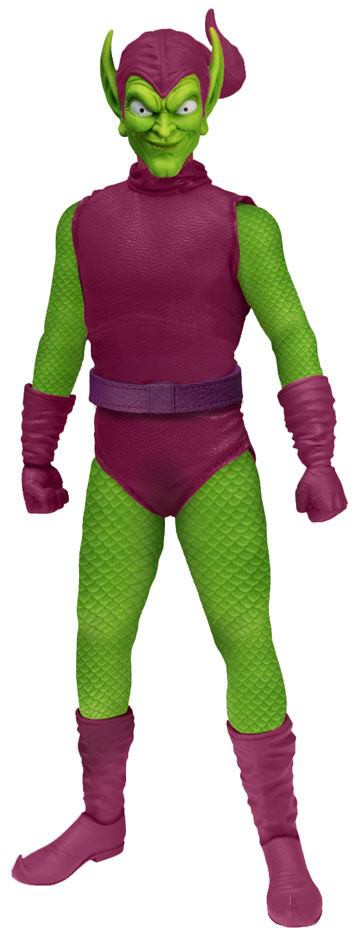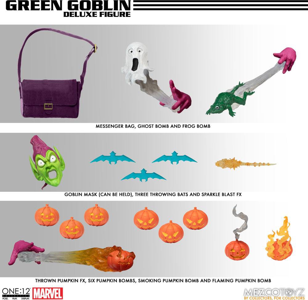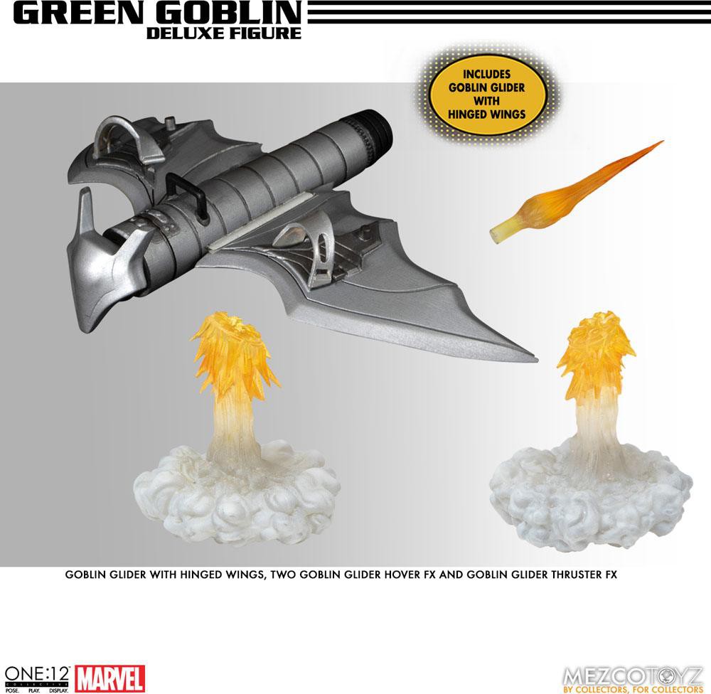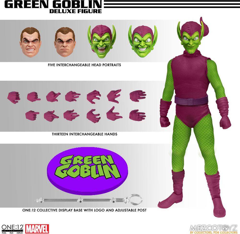 Green Goblin kommer till One:12 i sin klassiska look klädd i bodysuit, tunika, och väska som kan hålla hans bomber. Figuren är ca 17 cm hög och kommer med tre utbytbara huvuden. Green Goblin kommer självklart med sin Goblin Glider med tillhörande effektdelar.