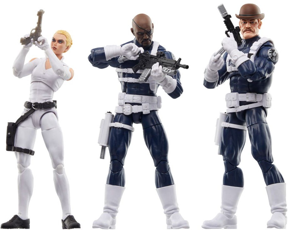 Bring the excitement and wonder of the Marvel Universe to your collection with Hasbro Marvel Legends S.H.I.E.L.D. 3-Pack figures! These collectible figures are detailed to look like the characters from Marvel's Captain America comics. 6-inch scale Marvel figures are fully articulated with poseable head, arms, and legs. Marvel action figure set comes with 37 accessories, including alternate hands for each figure, weapon accessories, and blast FX pieces. Multipack set also comes with 2 alternate heads. Hasbro Marvel action figures' 6 inch scale make them great for posing and displaying in fans' collections. Reimagine Captain America comics-inspired scenes on your shelf with Marvel Legends action figures.