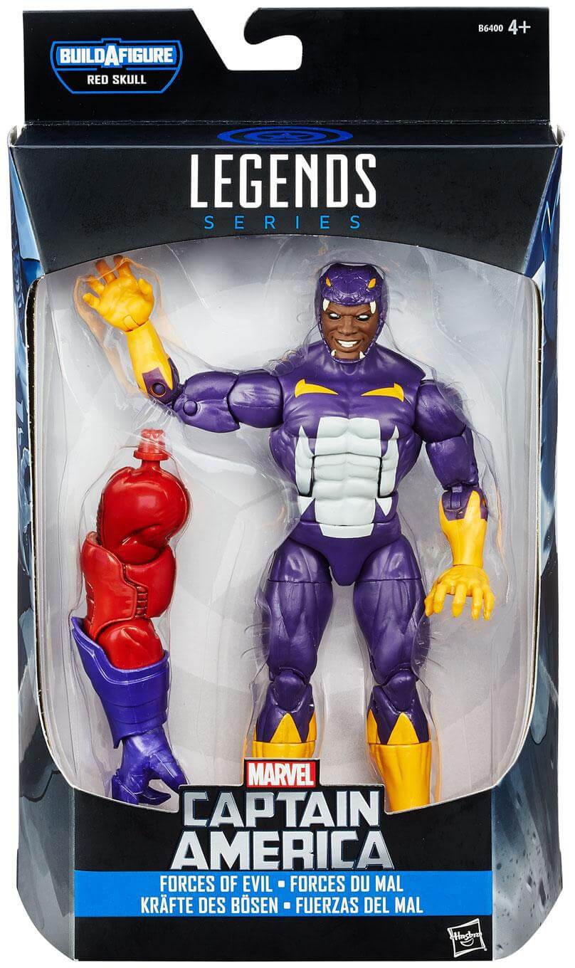 Forces of Evil: Cottonmouth in the set Marvel Legends Series Action Figures - Captain America 2016 Wave 1. This special ´Build-A-Figure´-assortment includes 7 action figures. Each figure stands approx. 15 cm tall and comes with additional parts to build an additional figure: Red Skull.