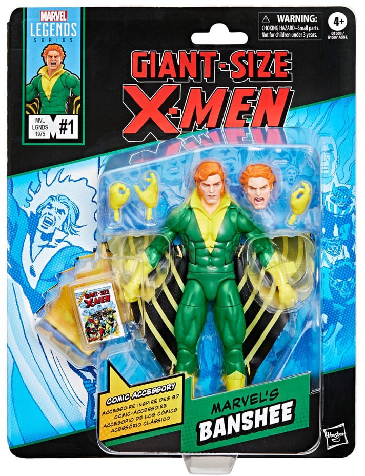 Bring the excitement and wonder of the Marvel Universe to your collection with Hasbro Marvel Legends Marvel's Banshee figure! Detailed to look like the character’s appearance in Marvel's Giant-Size X-Men #1 (1975), this collectible 6-inch scale Marvel figure is fully articulated with premium design and poseable head, arms, and legs. This Marvel action figure set comes with 5 accessories, including 3 alternate hands, alternate head portraying the character’s iconic sonic scream face, as well as a 6-inch scale plastic comic book accessory featuring the cover of Giant-Size X-Men #1 (1975). Hasbro Marvel action figures' 6 inch scale make them great for posing and displaying in fans' collections. Reimagine comics-inspired scenes on your shelf with Marvel Legends action figures and Marvel collectibles.