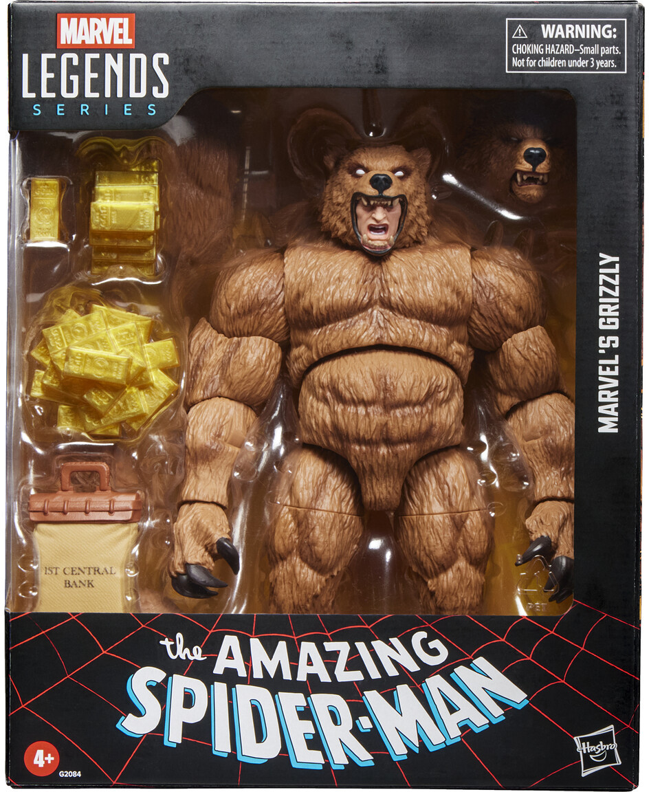 Marvel’s Grizzly, även känd som Maxwell Markham, söker hämnd på J. Jonah Jameson efter att hans brottningskarriär förstördes. För att få sin revansch använder han ett björntemat kraftförstärkande exoskelett och antar rollen som superskurken Grizzly. Figuren levereras med ett generöst urval av sju tillbehör, inklusive ett alternativt björnhuvud med rörlig käke, guldtackor och utbytbara klor.
