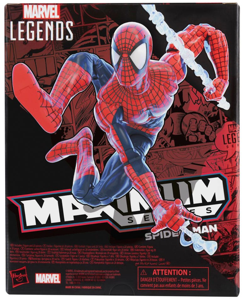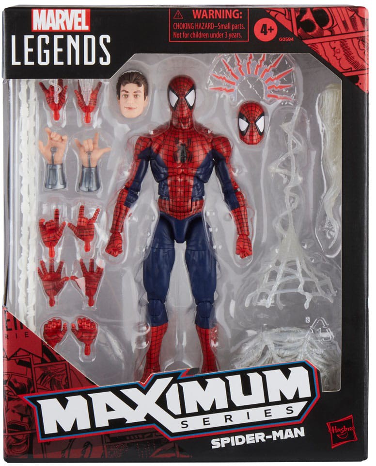Bring the excitement and wonder of the Marvel Universe to your collection with the Hasbro Marvel Legends Maximum Series Spider-Man figure! This collectible figure is detailed to look like the character from Marvel's Spider-Man comics. 6-inch scale Marvel figures are fully articulated with poseable head, arms, and legs. Maximum Series action figure set is bursting with 20 accessories, including: alternate unmasked Peter Parker head; alternate Spidey-sense head with removable tingle effect; 2 hands in THWIP pose; 2 hands launching webs; 2 wall-crawling hands; 2 hands with revealed web-shooters; 2 web-slinging hands that can grip the 2 web lines over 9 inches (22.5cm); backpack; web shield that can peg on the figure’s arm; plus web snare and web blast effect complete with a hinged web display stand. Hasbro Marvel action figures' 6 inch scale make them great for posing and displaying in fans' collections. Reimagine Spider-Man comics-inspired scenes on your shelf with Marvel Legends action figures.