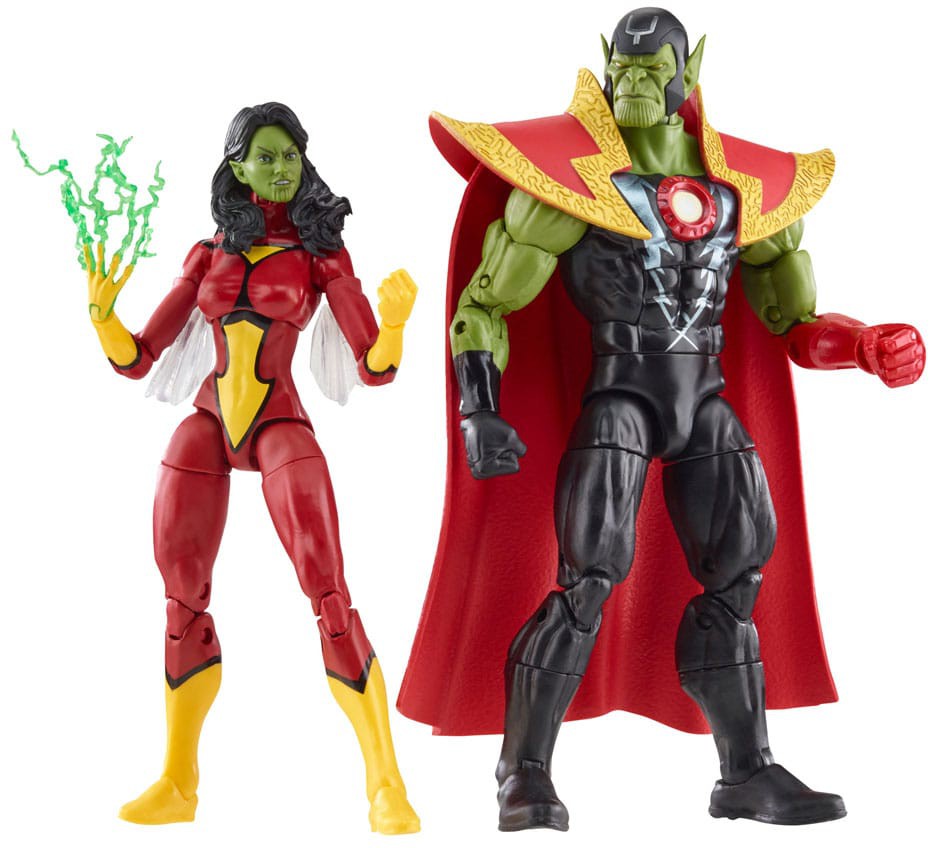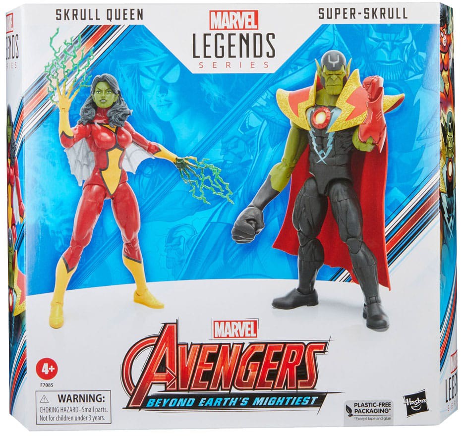 Det här Marvel Legends Avengers 60th Anniversary setet är detaljerat för att se ut som Skrull Queen och Super-Skrull-figurer från Marvel Secret Invasion-tidningarna, med förstklassiga detaljer och flera ledpunkter. Figurerna levereras med 9 tillbehör, inklusive alternativa händer för varje figur, alternativt Spider-Woman -imitationshuvud för Skull Queen och alternativa vingar.