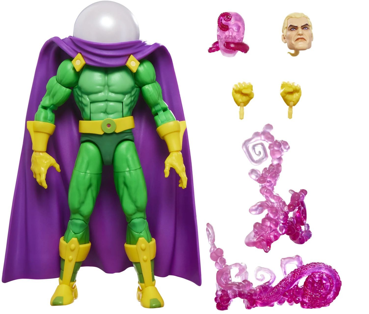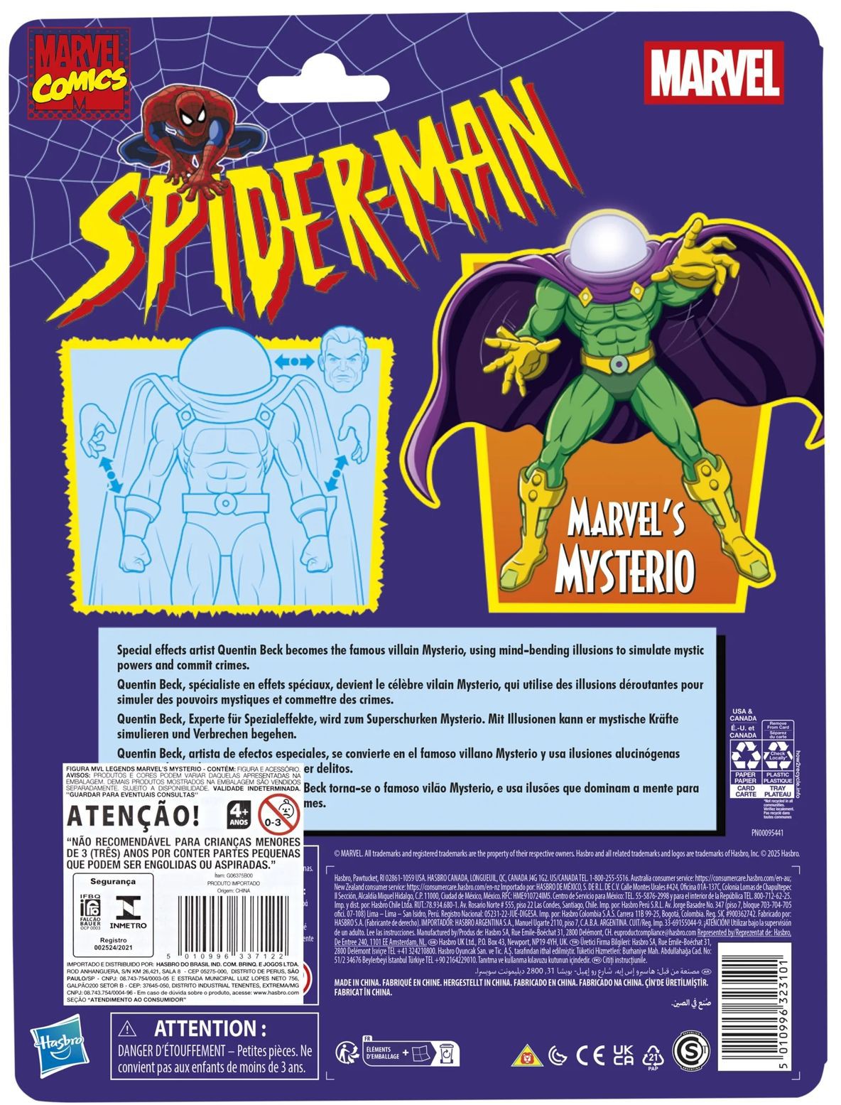 Hasbro presenterar, inom Marvel Legends Series, den här ledade figuren av Mysterio, inspirerad av hans utseende i Spider-Man: The Animated Series. Figuren är cirka 15 cm hög och har flera rörliga leder för dynamiska poser. Designen är premium och trogen animationsseriens utseende. Innehåller ett alternativt huvud utan hjälm med Quentin Becks ansikte, två extra händer och tre effektdelar (två rökspiraler och en dödskalleeffekt). Levereras i retro-blisterförpackning med illustrationer. Begränsad upplaga.