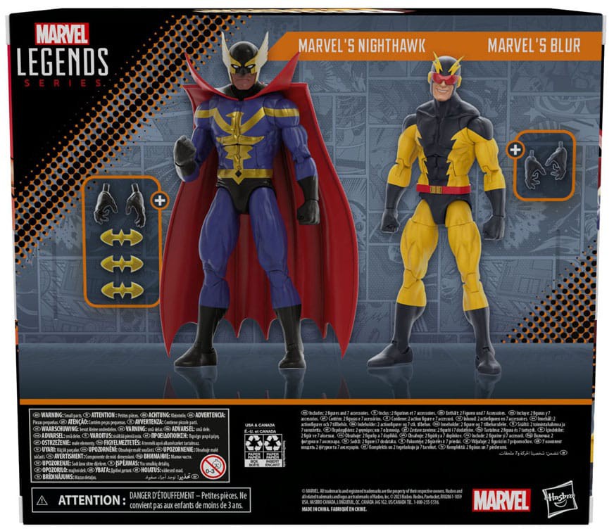Bring the excitement and wonder of the Marvel Universe to your collection with Hasbro Marvel Legends Marvel's Nighthawk and Marvel's Blur action figures! This collectible 6-inch -scale Marvel comics action figure 2-pack is designed to look like the characters from Marvel's Squadron Supreme comics. These Marvel Legends figures are fully articulated with premium design and poseable heads, arms, and legs. Marvel action figure set comes with 7 accessories, including alternate hands for each character and character-inspired weapons for Marvel's Nighthawk. Hasbro Marvel action figures' 6 inch scale make them great for posing and displaying in fans' collections.