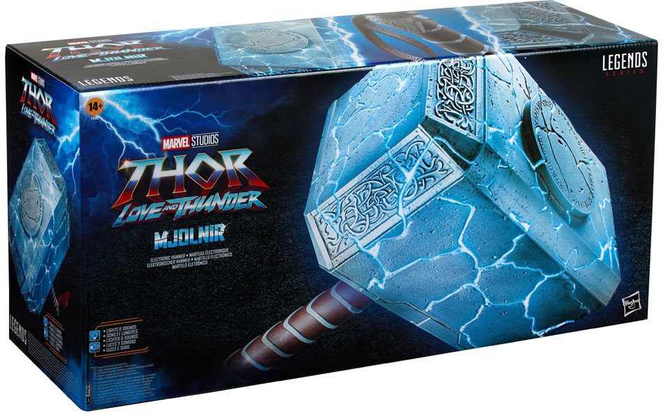 Ett av de mest ikoniska vapnen i Marvel Cinematic Universe, den legendariska och allsmäktiga hammaren Mjolnir, är nu i händerna på Mighty Thor! Marvel Legends presenterar stolt denna reproduktion i skala 1:1 av Mjolnir som den ser ut i Marvel Studios Thor: Love and Thunder! Med filmexakt skulptur och detaljer över hammaren, inklusive unik texturering över hammarhuvudet för att återspegla dess utseende i filmen, är detta nästa viktiga Marvel Legends rollspelsobjekt för din samling! Sätt igång de filminspirerade ljus- och ljudeffekterna och föreställ dig att släppa lös åskan!