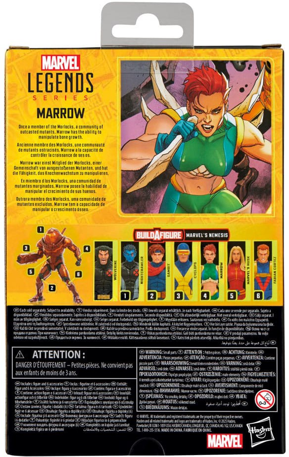 Bring the excitement and wonder of the Marvel Universe to your collection with Hasbro Marvel Legends Marrow X-Men figure! This collectible 6-inch scale Marvel figure is detailed to look like the character from Marvel's X-Men comics. Marrow action figure is fully articulated with premium design and poseable head, arms, and legs. Marvel action figure set comes with 4 accessories and 2 Marvel's Nemesis Build-A-Figure pieces. Complete the additional figure with Marvel Legends X-Men action figures Nightcrawler, Gambit, Cyclops, Marvel's Husk, and Fabian Cortez. (Each sold separately. Subject to availability.) Hasbro Marvel action figures' 6 inch scale make them great for posing and displaying in fans' collections. Reimagine X-Men comics-inspired scenes on your shelf with Marvel Legends action figures and Marvel collectibles.