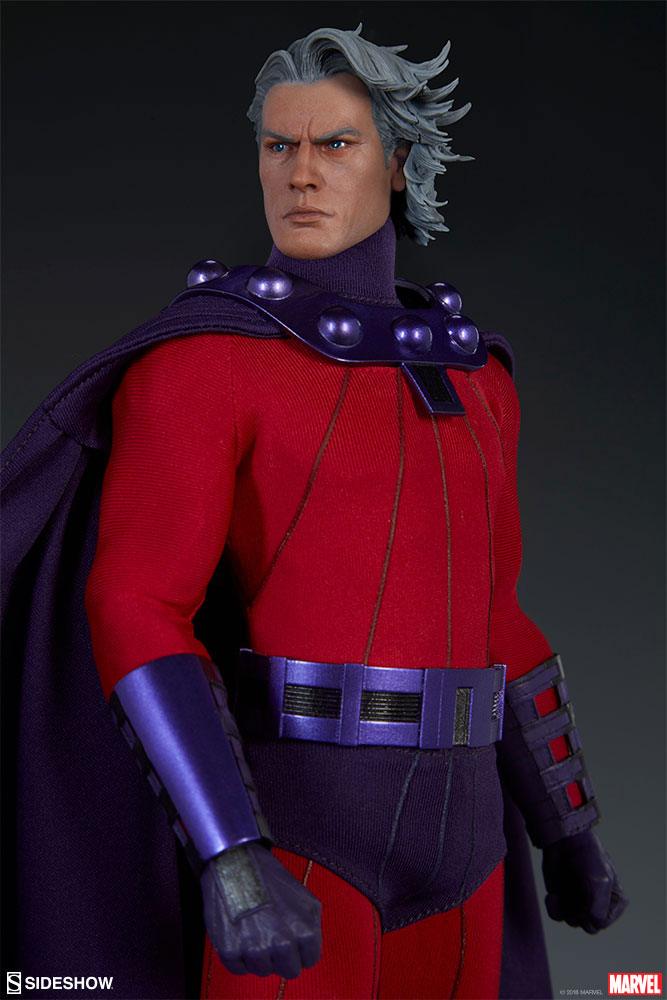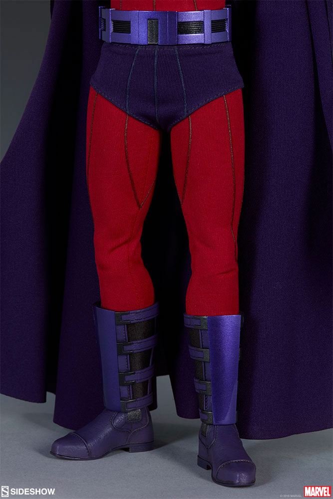Inspired by the character's comic book appearance, the Magneto Sixth Scale Figure features a detailed fabric costume, which includes a red body suit with raised textures, purple shorts, and a wired, posable purple cape. The costume also includes sculpted elements such as his metallic purple belt and mantle, and sculpted boots and wrist guards. Magneto also features seven different hands, including a pair of fists, a pair of flight hands, a pair of crushing hands, and one left hand with a non-removable levitating effect.