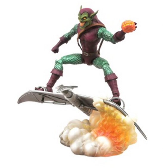 Equipped with Marvel Select's standard 16 points of articulation, this 7-inch figure can perch on top of his included base, a perfectly balanced Goblin Glider wrapped in smoke. The Green Goblin comes in oversized collector packaging, ready for display.