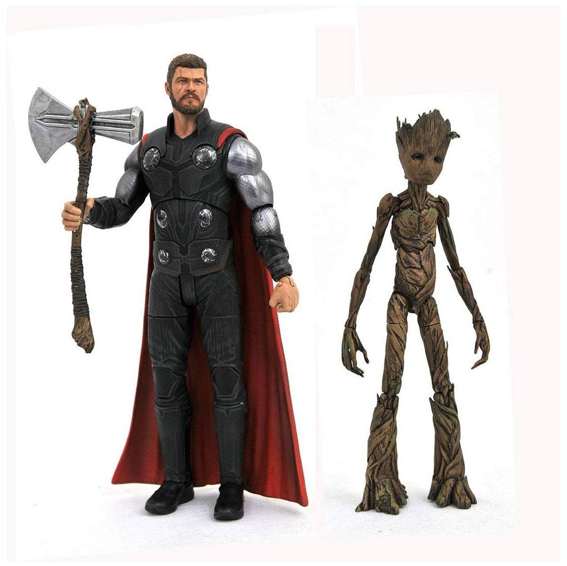 This 7" scale action figure of Thor features approximately 16 points of articulation and interchangeable parts and accessories, plus a poseable figure of an adolescent Groot, from the Guardians of the Galaxy! Packaged in the full-color, display-ready Select packaging, with side-panel artwork for shelf reference.