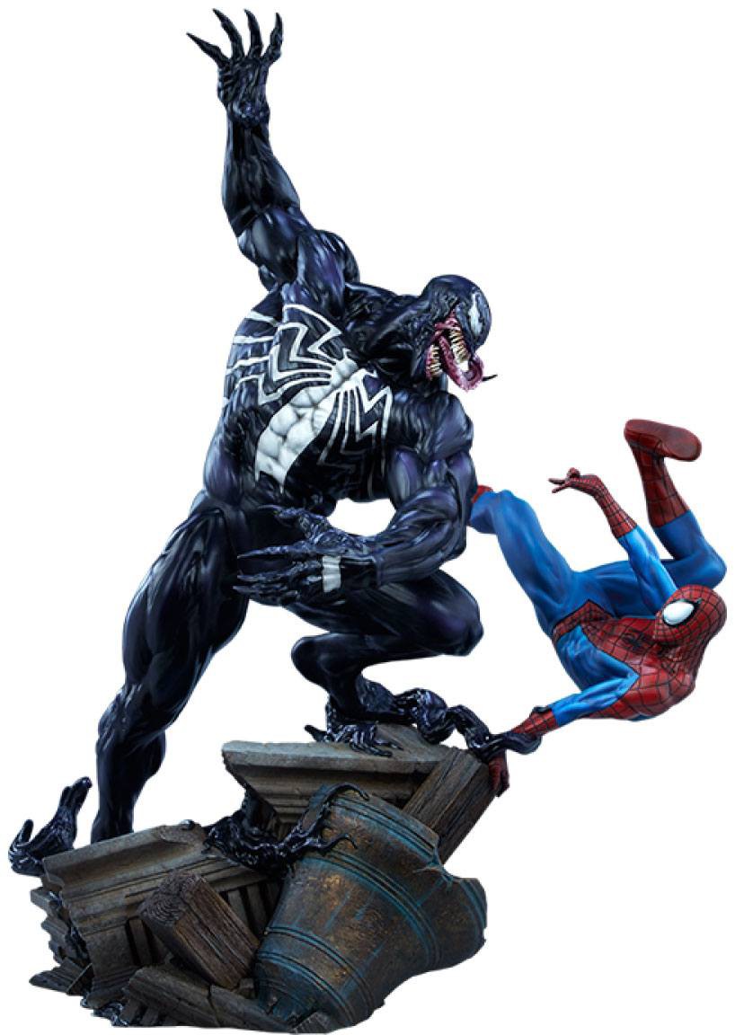 Spider-Man vs Venom Maquette är 22 cm lång när Spindelmannen och hans fiende kämpar på vraket av ett klocktorn. Tendrils av den olyckliga utomjordiska symbioten snirlklar sig runt basen och tar tag i Peter Parkers arm när han tar sikte på Eddie Brocks förändrade jag.