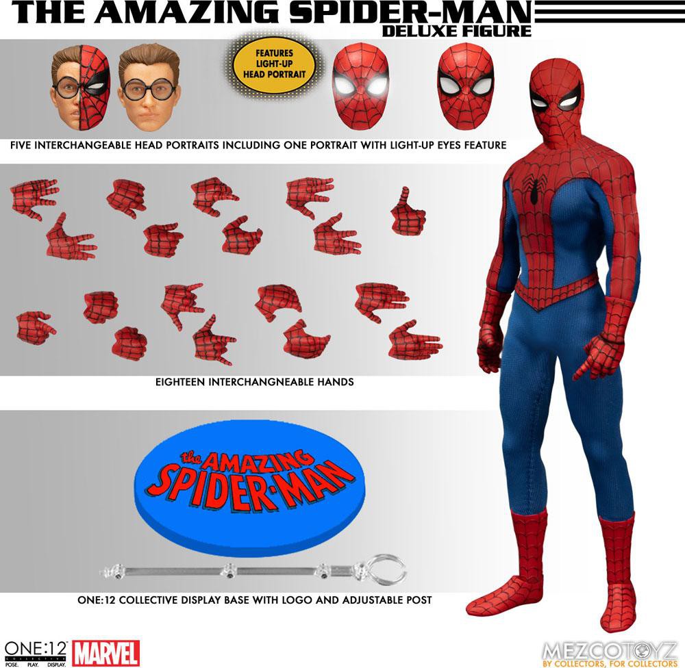 Spider-Man kommer till One:12 med denna deluxe actionfigur. Figuren är ca 16 cm hög och kommer med fem olika huvuden och flera olika tillbehör.