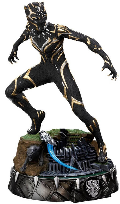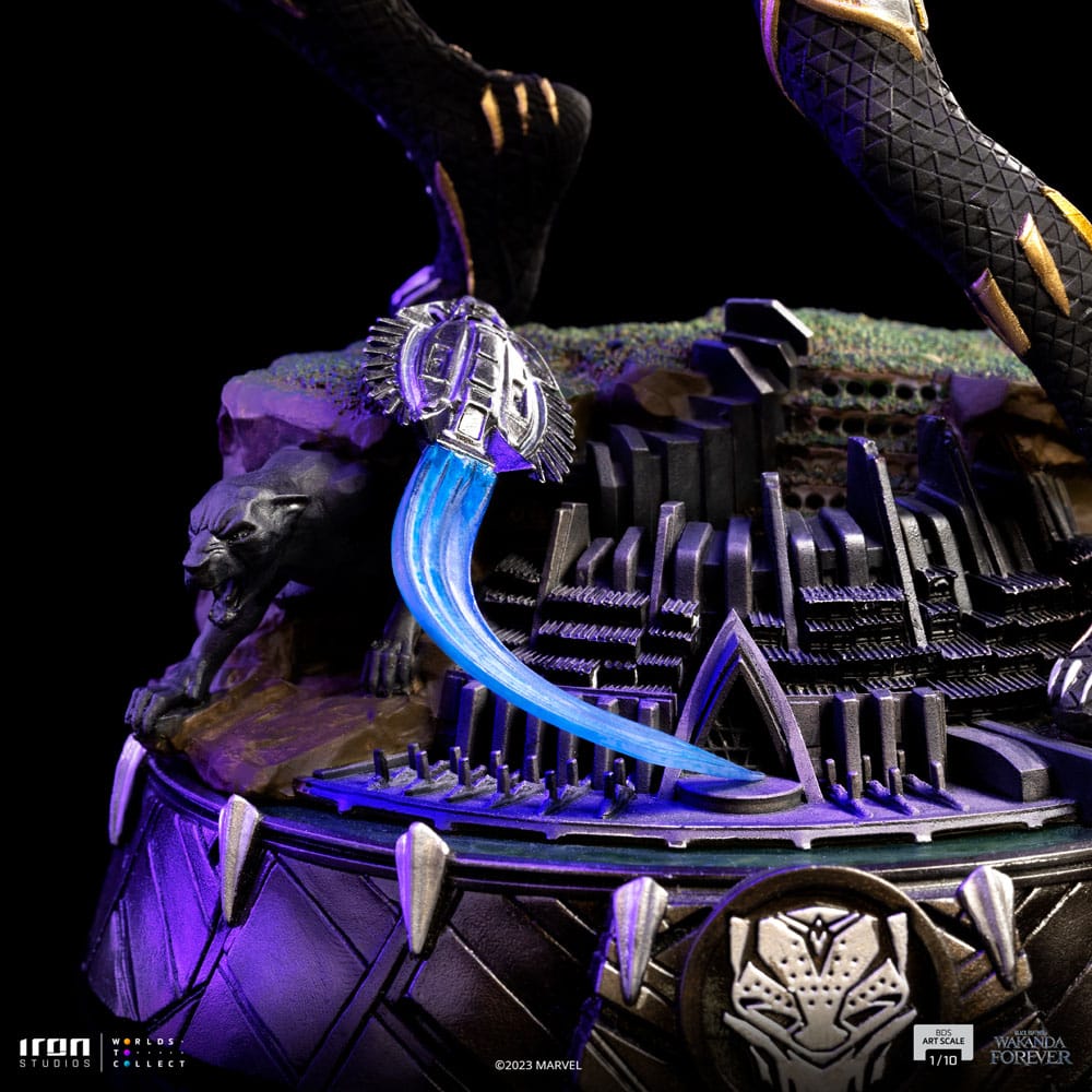 Wearing a costume designed by herself, light and almost indestructible, made exclusively of Vibranium that makes her immune to most of the physical damage from conventional weapons. Ready for combat with retractable and extendable Vibranium claws embedded in the gloves, and equipped with sound-absorbing shoes that nullify all the noise and allow her to move like a true feline. Over a base filled with details that present the royal palace of Wakanda in miniature, a Wakandan aircraft Royal Talon Fighter taking off, the panther symbol totem statue appearing between the rocks, with all her back decorated with silver claws, and the coat of arms in the front, Iron Studios proudly present the statue "Black Panther Shuri BDS - Wakanda Forever - Art Scale 1/10", with the princess of Wakanda taking on the majestic mantle of the Panther and continuing the legacy of her brother as seen in the 30th movie of the MCU, nominated for 5 Academy Awards (Winner of Best Costume Design), 2 Golden Globes and 2 Screen Actors Guild Awards.