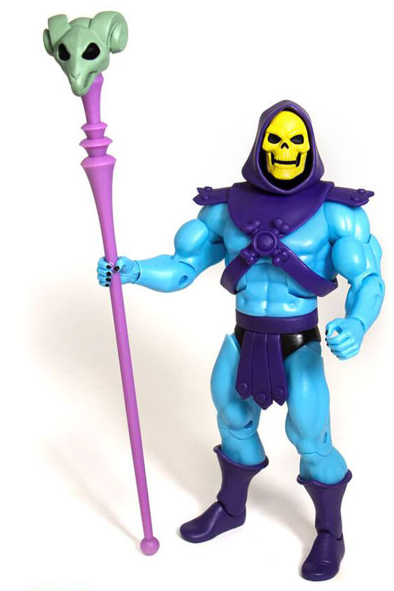 Evil Skeletor, Lord of Destruction is packaged with Havoc Staff, Skeletor Sword, Skeletor Axe, and the Diamond Ray of Disappearance accessories. You can also re-enact Skeletor's mocking laughter with the additional Laughing Skeletor Head!