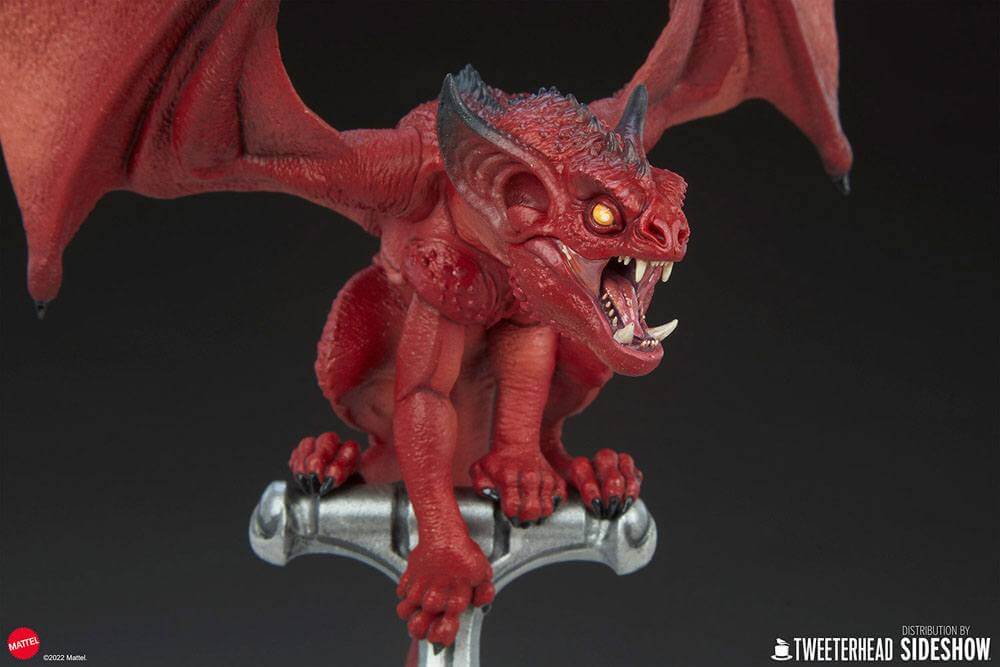 The polyresin MOTU statue depicts the creature perched atop a Fright Zone-themed base that matches perfectly with its master, the Tweeterhead Hordak Legends Statue, sold separately. The Minion's striking crimson coloration catches the eye, as the figure watches with open wings and a toothy grin while the Evil Horde marches through Etheria, Eternia, and beyond.