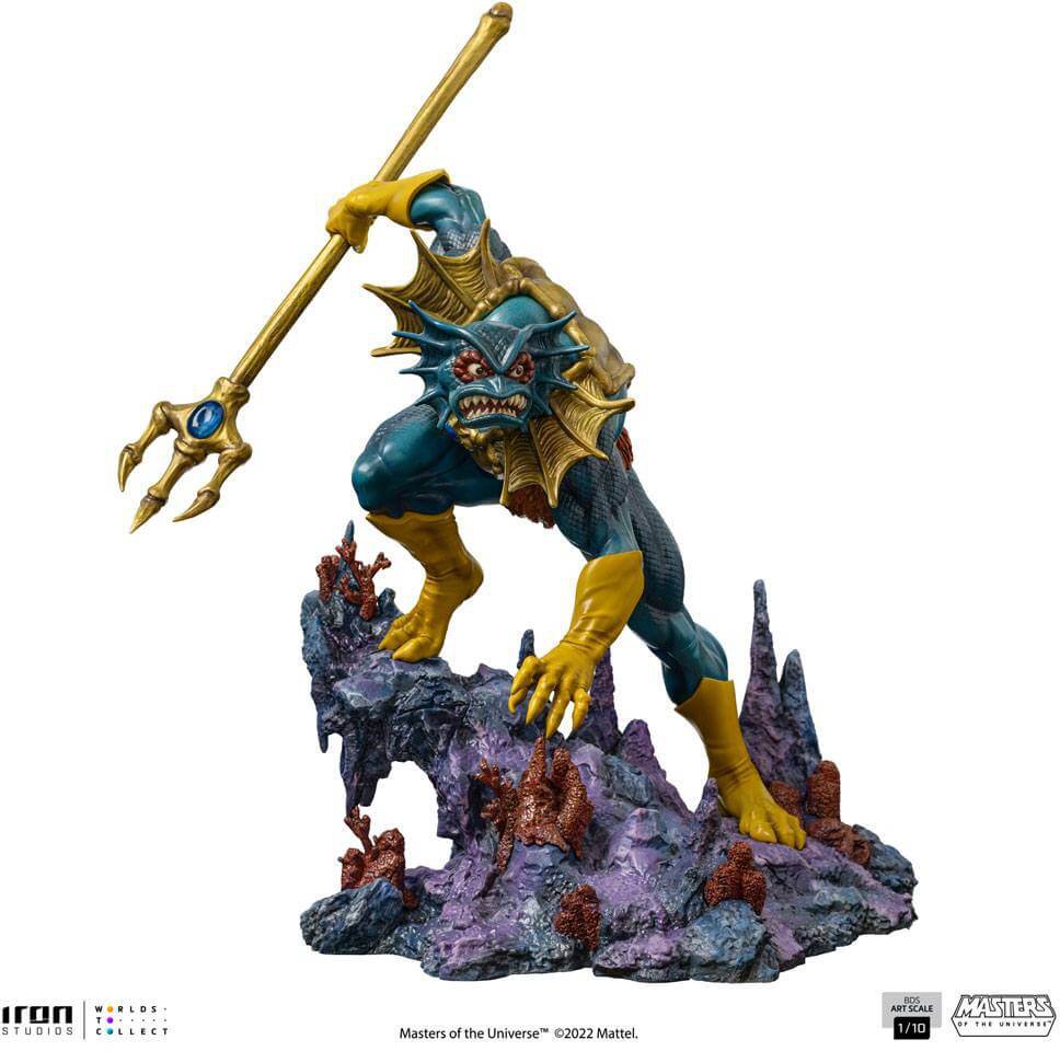 Bowing over the sea rocks, stalagmites, and corals in the deep of the ocean of Eternia, the humanoid merman ruler of the people known as the Aquaticans gets ready to attack and repel against any trespasser on his domains, wielding his golden trident and expressing the fury on his face. With part of his green-skinned body partially covered by scales and protected by a golden chest armor with shoulder pads in the shape of fins, Iron Studios present the statue "Mer-Man BDS - Masters of the Universe- Art Scale 1/10" with the fish-man lord of the undersea kingdom, an ally of Skeletor's forces and member of the Evil Warriors of Eternia.