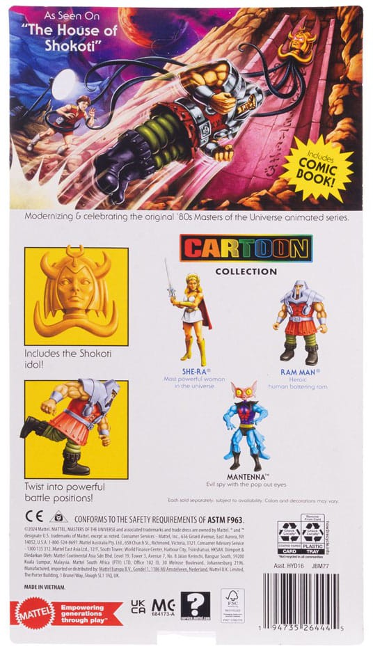 Från Mattels ”Masters of the Universe”-serie kommer denna mycket välartikulerade och fullt rörliga actionfigur. Den är ca 14 cm hög och levereras med tillbehör i en blisterkortsförpackning.