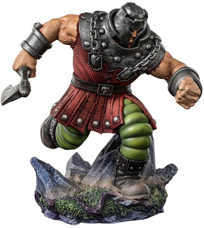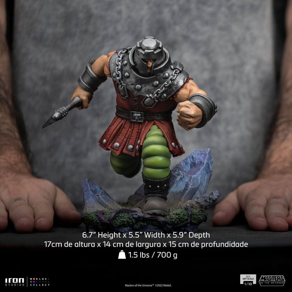 Med tunga steg mellan klipporna på Planet Eternia springer en liten och robust krigare med sin stridsyxa redo att attackera sina motståndare. Med sin rustika platta metallhjälm och en massiv rustning som täcker hans överkropp, presenteras denna orädda heroiska krigare i statyn av Iron Studios.