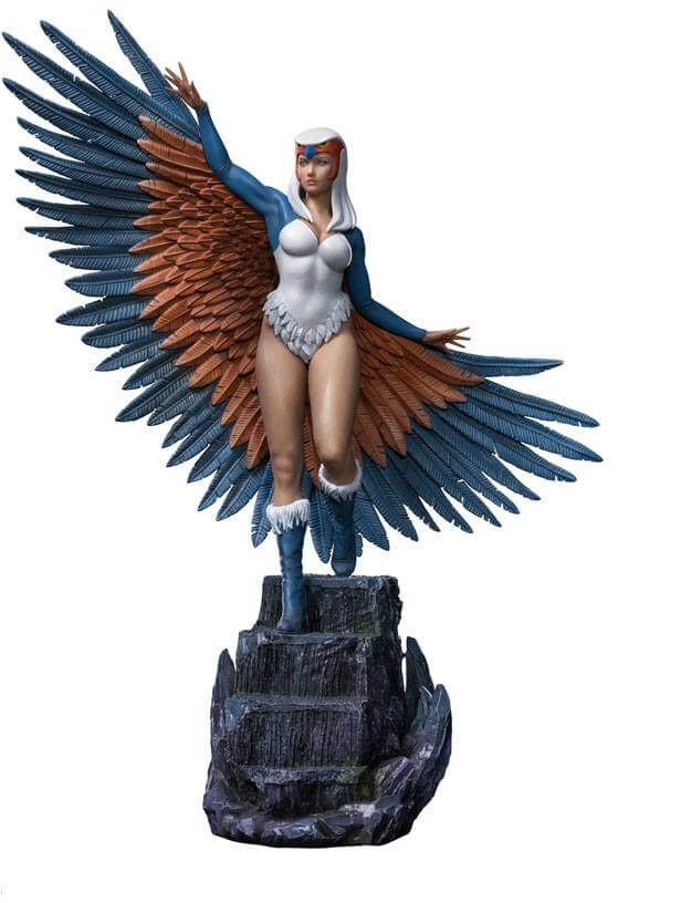 Exceptionally powerful within the limits of the castle of which she is the guardian, the beautiful sorceress raises her arms, opening part of the big wings with blue and orange feathers that compose her costume. Wearing a type of swimsuit and blue and white boots, with her head covered by a helmet in the shape of a falcon's head, she gestures using her wide range of magic skills, while going down the stairs of Castle Grayskull. Thus, Iron Studios present the statue "Sorceress BDS - Masters of the Universe - Art Scale 1/10", with the wise and altruistic watcher of the secrets contained in Eternia's ancestral fortress, and He-Man's counselor and mentor.