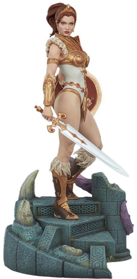 The Teela Maquette measures close to 18.5" tall when fully assembled - figure and base. This fully-sculpted polyresin statue comes equipped with Teela's classic sword and shield as well as not one, but two different portraits - Modern (with pony tail) and Classic (updo).