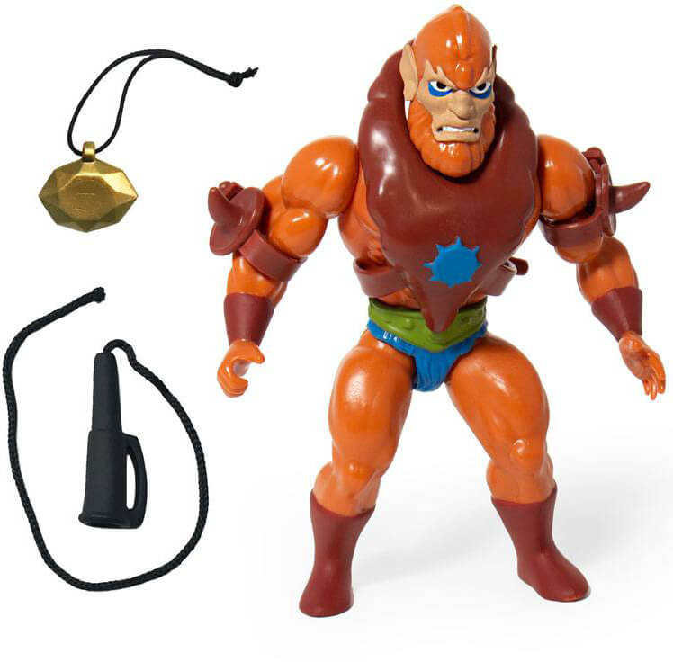 The Beast Man 5.5" Vintage figure comes with whip and amulet accessories and features a spring-loaded mechanism: Turn the waist and he swings back with a punch! The packaging includes a custom character history card and has new and original art on the back of the card.