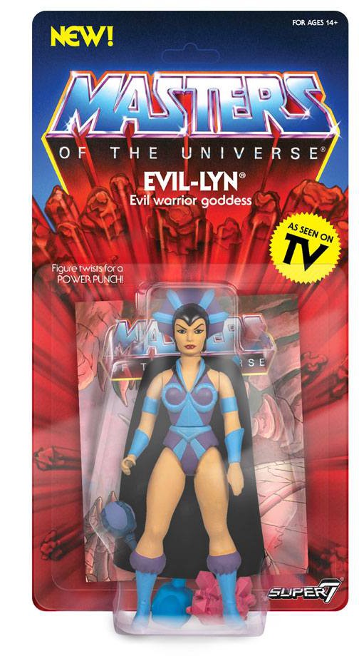 The Evil-Lyn 5.5-inch Vintage Figure comes with Staff, Crystal Ball, Corodite Crystal, and cape accessories and features a spring loaded mechanism: Turn the waist and he swings back with a punch! The packaging includes a custom character history card with the figure and has new and original art on the back of each card.