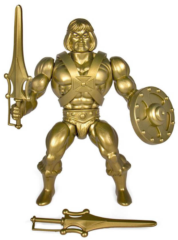 The Gold Statue He-Man 5.5-inch Vintage Figure comes with Power Sword, Half-Sword, and Shield and features a spring loaded mechanism: Turn the waist and he swings back with a punch! The packaging includes a custom character history card with the figure and has new and original art on the back of each card (Packaging is not finalized but will be posted when available).