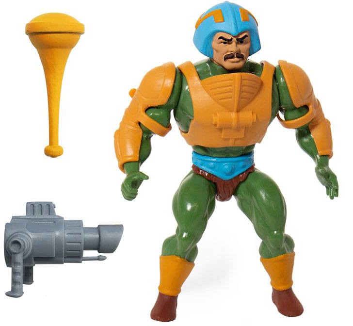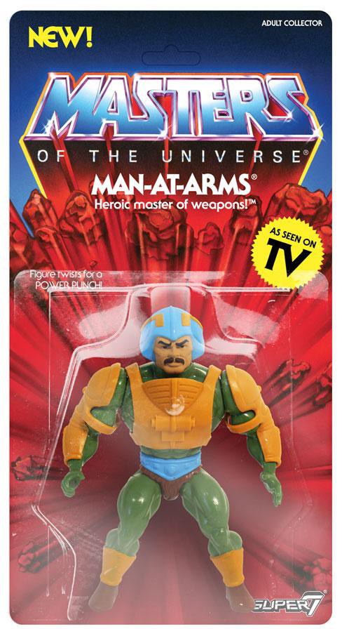 The Man-At-Arms 5.5-inch Vintage figure comes with club and laser accessories and features a spring-loaded mechanism: Turn the waist and he swings back with a punch! The packaging includes a custom character history card and has new and original art on the back of the card.