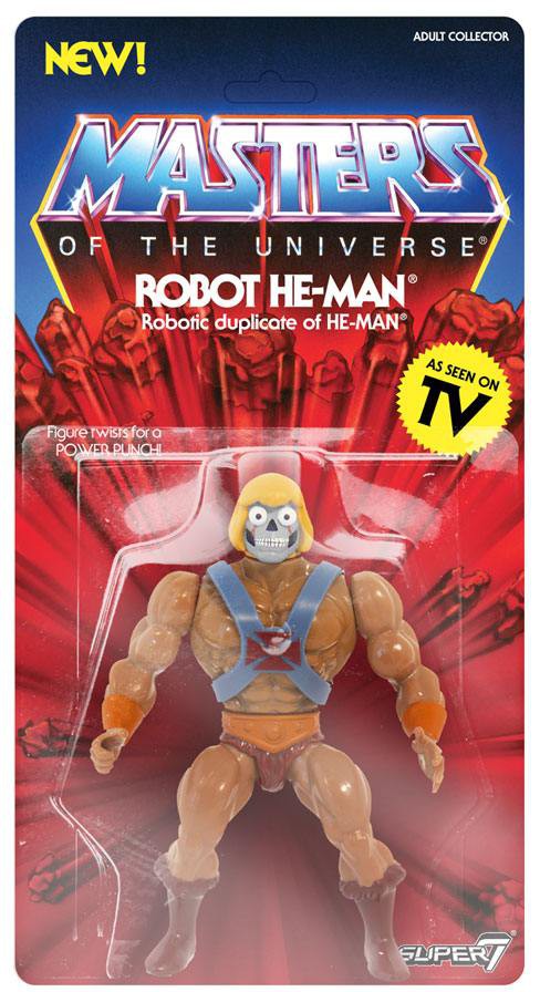 The Robot He-Man 5.5" Vintage figure comes with sword and shield accessories and features a spring-loaded mechanism: Turn the waist and he swings back with a punch! The packaging includes a custom character history card and has new and original art on the back of the card.