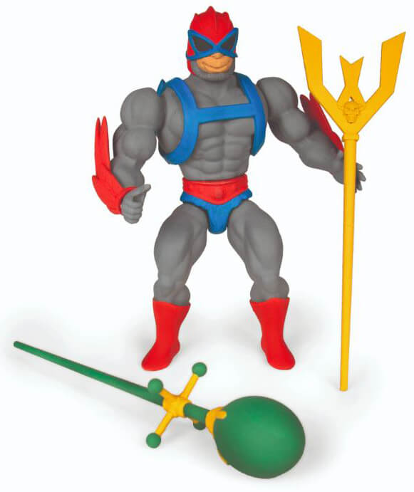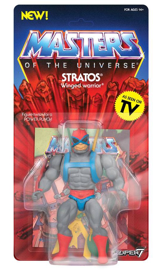 The Stratos 5.5-inch Vintage Figure comes with Mini Comic Staff and Emerald Staff of Avion accessories and features a spring loaded mechanism: Turn the waist and he swings back with a punch! The packaging includes a custom character history card with the figure and has new and original art on the back of each card.
