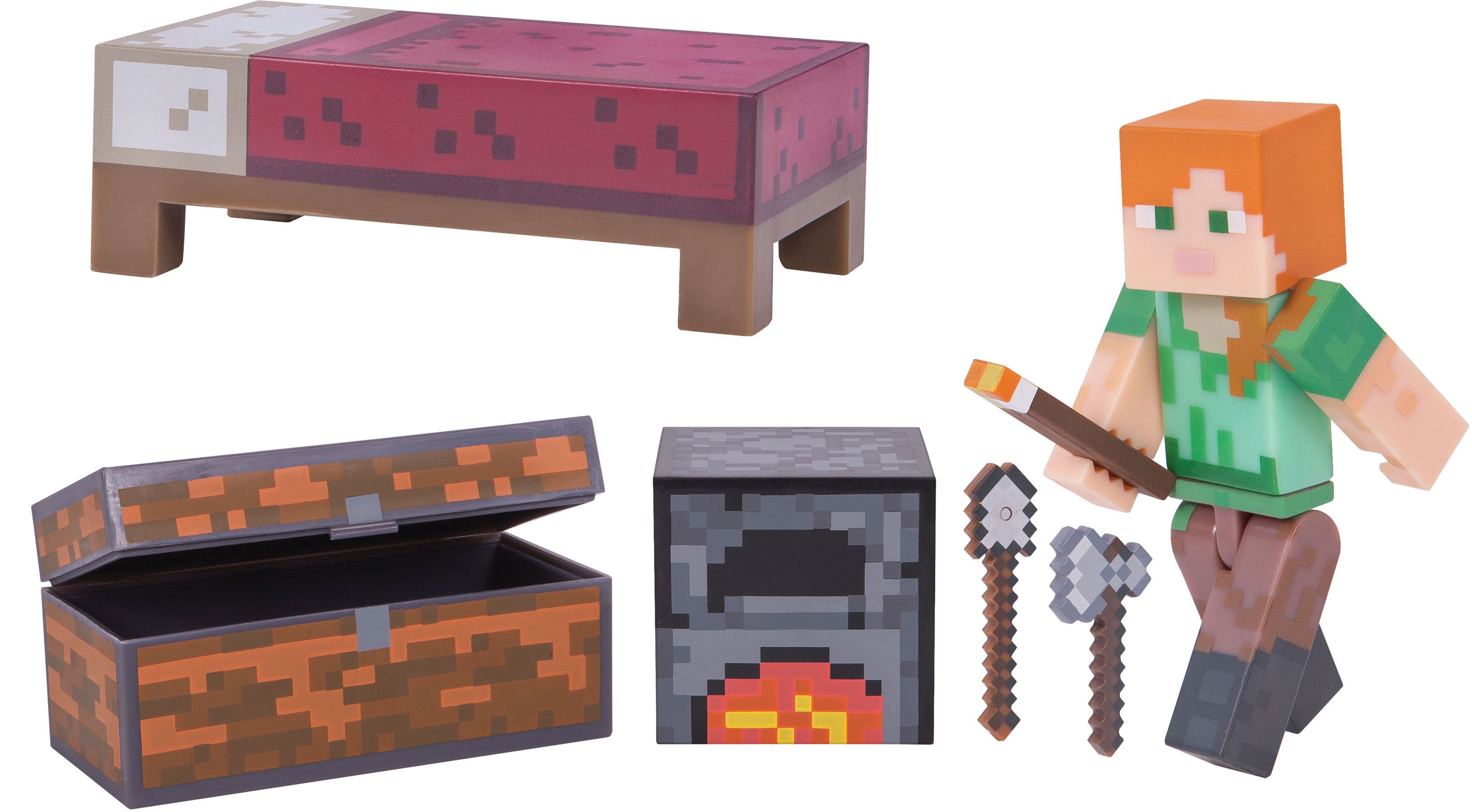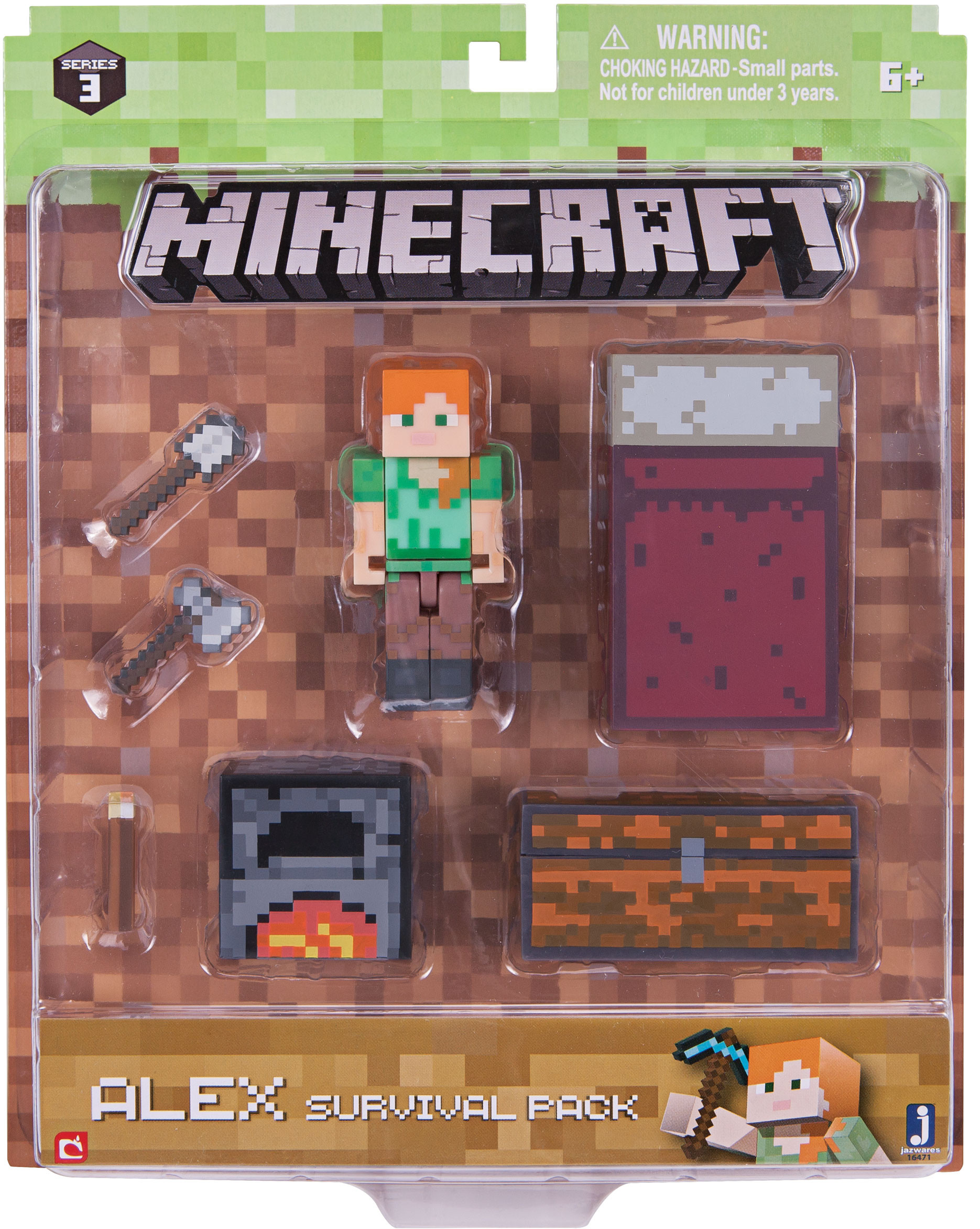 Från det omåttligt populära spelet Minecraft kommer här en 8 cm hög actionfigur av Alex tillsammans med många tillbehör.