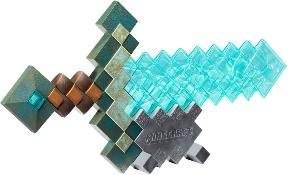 Ett diamantsvärd är ett viktigt verktyg för den skicklige äventyraren och skyddar dig mot alla typer av fientliga monster. Denna samlarreplika återskapar dess slitstarka klinga med en antik finish, kombinerad med en gjutjärnsstruktur och konstläderlook. Svärdet är 50 cm långt och 25 cm brett vid handtaget och levereras med ett stativ präglat med Minecraft-logotypen som fungerar både som väggfäste och skrivbordsställ (inkluderar två skruvar och gipsankare).