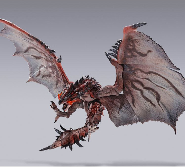 S.H. MonsterArts series, renowned for its attention to realistic detail and articulation, is proud to announce the second release from the Monster Hunter game series. Overseen by director Kaname Fujioka, it captures the monster exactly as seen on screen, with incredible detail and natural posability that brings Rathalos to three-dimensional life. Option parts let you swap between open and folded wings. Effect parts let you re-create its fire breath to expand your display possibilities. The set includes the figure, a pair of eployment wing large parts(L/R), a pair of eployment wing small parts(L/R), a stand, and fire breath effects.