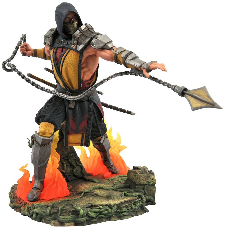 A Diamond Select Toys release! Get over here! From the hit Mortal Kombat video game franchise, wearing his outfit from Mortal Kombat 11, Scorpion launches his kunai (chain-spear thingy) at an opponent in this dynamic, deluxe Gallery Diorama.