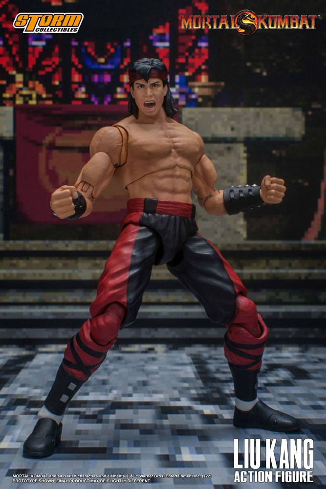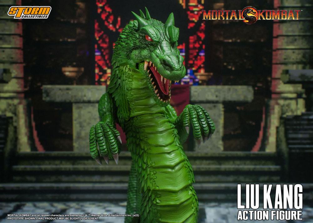Liu Kang actionfigur och drake. Figurerna är fullt ledade och Liu Kang kommer med utbytbara huvuden, flera par händer samt en eldboll effekt. Figuren är ca 18 cm hög och i skala 1/12.