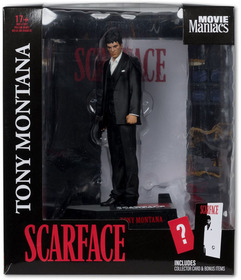 Fira den ikoniska filmen 'Scarface' med denna detaljerade figur av Tony Montana från McFarlane Toys Movie Maniacs-serie. Figuren är noggrant utformad för att återspegla Tony Montanas karaktäristiska drag och levereras med tryckta tillbehör, inklusive en bakgrund och en bas. Perfekt för samlare och fans som vill lägga till en högkvalitativ representation av Tony Montana till sin samling.
