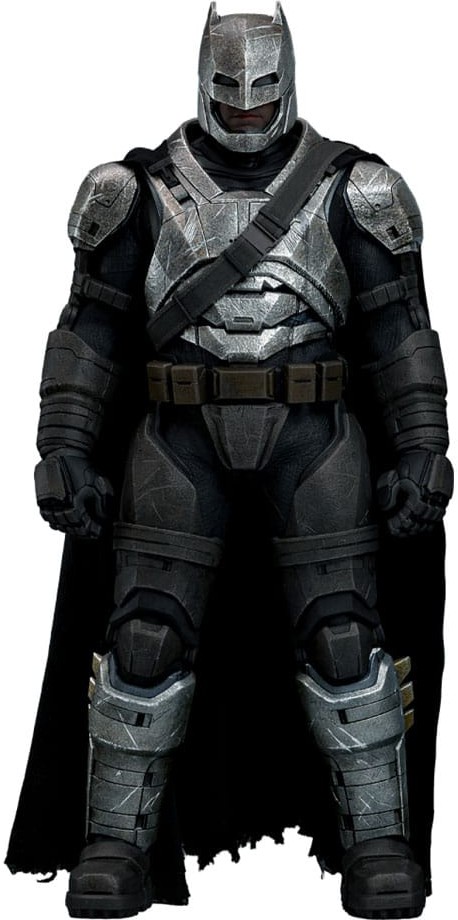 Den filmtrogna DC Comics-actionfiguren är omsorgsfullt tillverkad utifrån Ben Afflecks bild av Armored Batman från filmen, med ett nyutvecklat pansarhuvud i diecast med LED-belysta ögon och tre utbytbara nedre ansikten som fångar Ben Afflecks ansiktsuttryck omsorgsfullt tillverkad stridsdräkt med förbättrad färgapplicering och vädereffekter; ett urval av rustningar i diecastmaterial; helt ny omdesignad, mycket detaljerad kropp med förbättrad artikulering; detaljerad grippistol och granatpistol. Innehåller även ett LED-belyst figurställ med filmlogotyp för lite mer historieberättande.