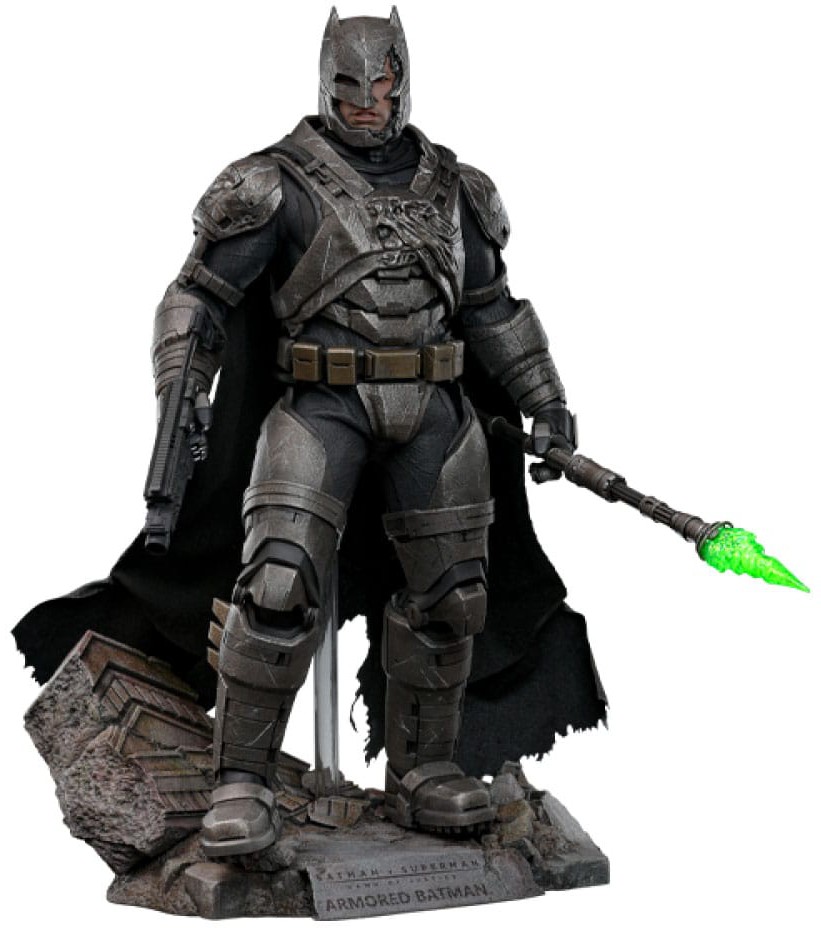 Den filmtrogna DC Comics-actionfiguren är omsorgsfullt tillverkad utifrån Ben Afflecks bild av Armored Batman från filmen, med ett nyutvecklat pansarhuvud i diecast med LED-lampor i ögonen och tre utbytbara nedre ansikten som fångar Ben Afflecks ansiktsuttryck omsorgsfullt tillverkad stridsdräkt med förbättrad färgapplicering och vädereffekter; ett urval av rustningar i diecastmaterial, helt ny omdesignad, mycket detaljerad kropp med förbättrad artikulering, detaljerad grippistol och granatpistol.