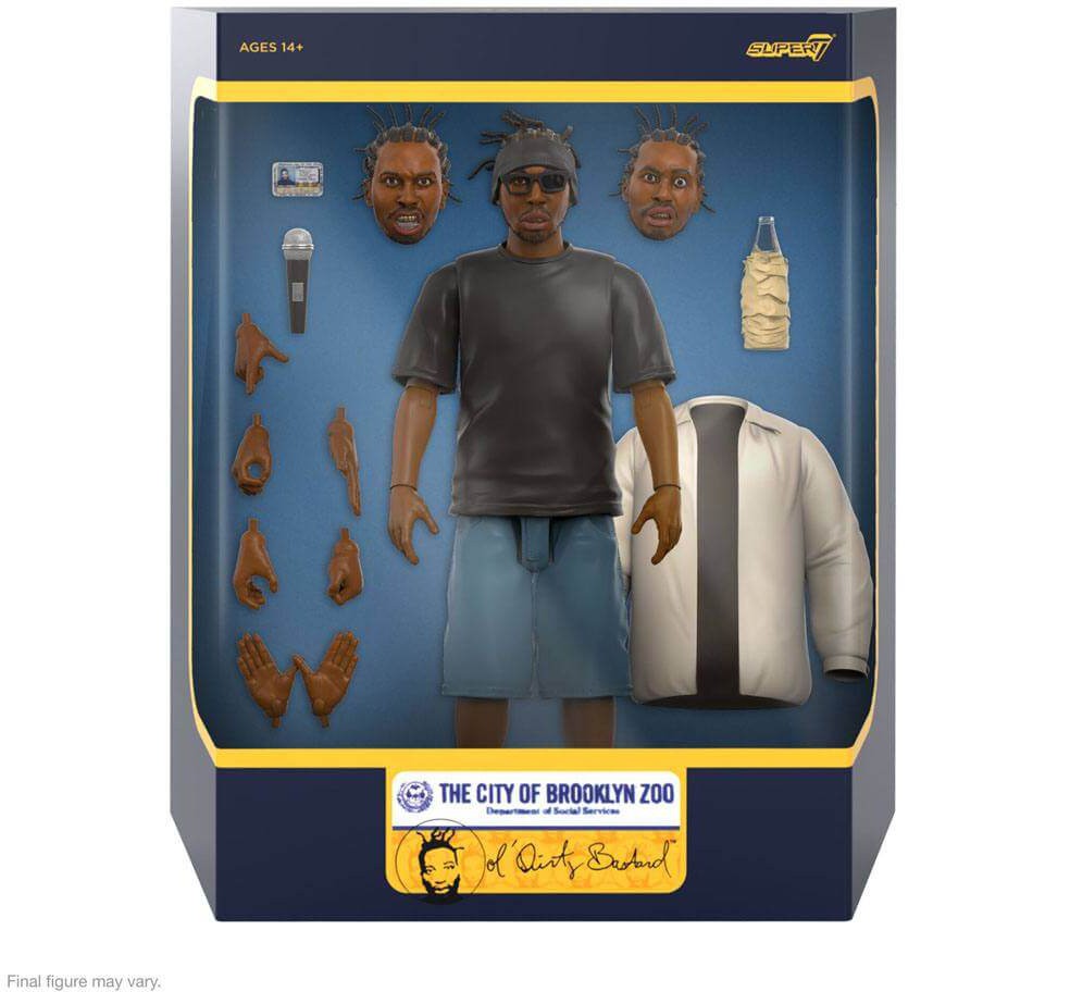 Denna 7-tums skala, mycket rörliga ULTIMATES! Figur av Ol' Dirty Bastard framhäver hans unika persona och kommer med utbytbara huvuden och händer, en jacka av tyg och tillbehör som inkluderar en mikrofon, flaska och ID-kort.
