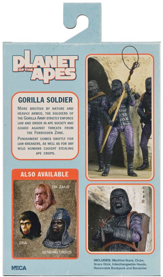 Build your Gorilla Army and defend against wild humans with this Planet of the Apes Ultimate action figure! The Gorilla Solider from the beloved 1968 film is getting NECA's "Ultimate" treatment as a 7-inch scale action figure with an arsenal of accessories: three interchangeable heads, two batons, catching pole, rifle, belt, machine gun, removable backpack, and alternate hand. Comes in collector-friendly, Ultimate five-panel window box packaging.