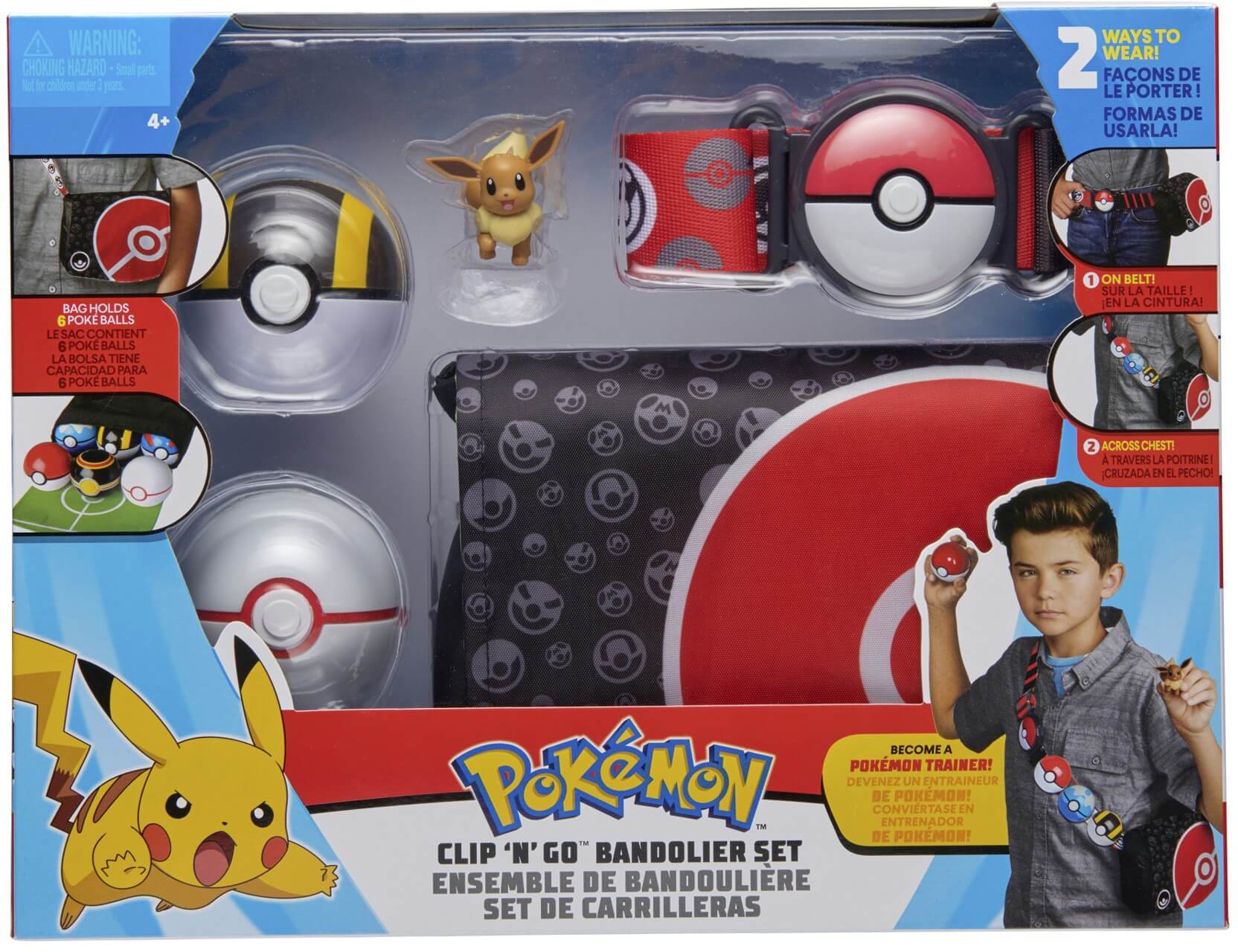 Get ready to become a Pokémon Trainer! The Clip 'N' Go Pokéball Bandolier set includes one adjustable belt, two Poké Balls, shoulder bag and one 5 cm figure. Belt / bag can hold up to six Poké Balls at once.