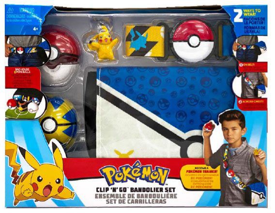 Get ready to become a Pokémon Trainer! The Clip 'N' Go Pokéball Bandolier set includes one adjustable belt, two Poké Balls, shoulder bag and one 5 cm figure. Belt / bag can hold up to six Poké Balls at once.