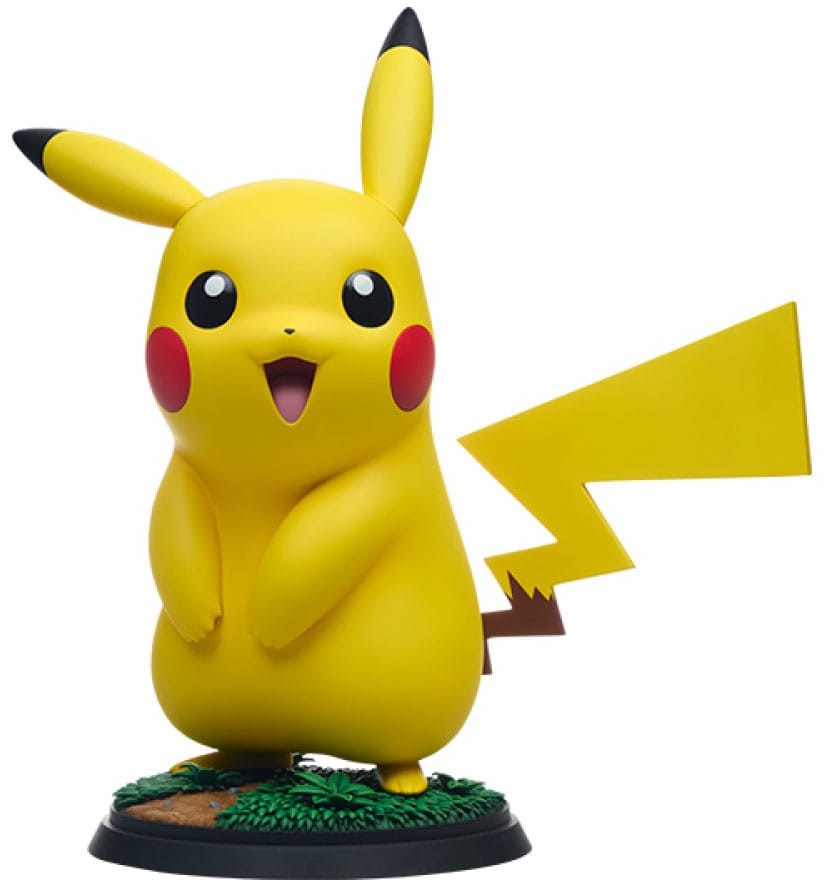 Figuren är skalenlig i verklig storlek och mäter cirka 47 cm hög, 45 cm bred och 25 cm djup. Den är tillverkad i polystone med handmålade detaljer som Pikachus glada uttryck, röda kinder och blixtformade svans. En perfekt mittpunkt i varje Pokémon-samling.
