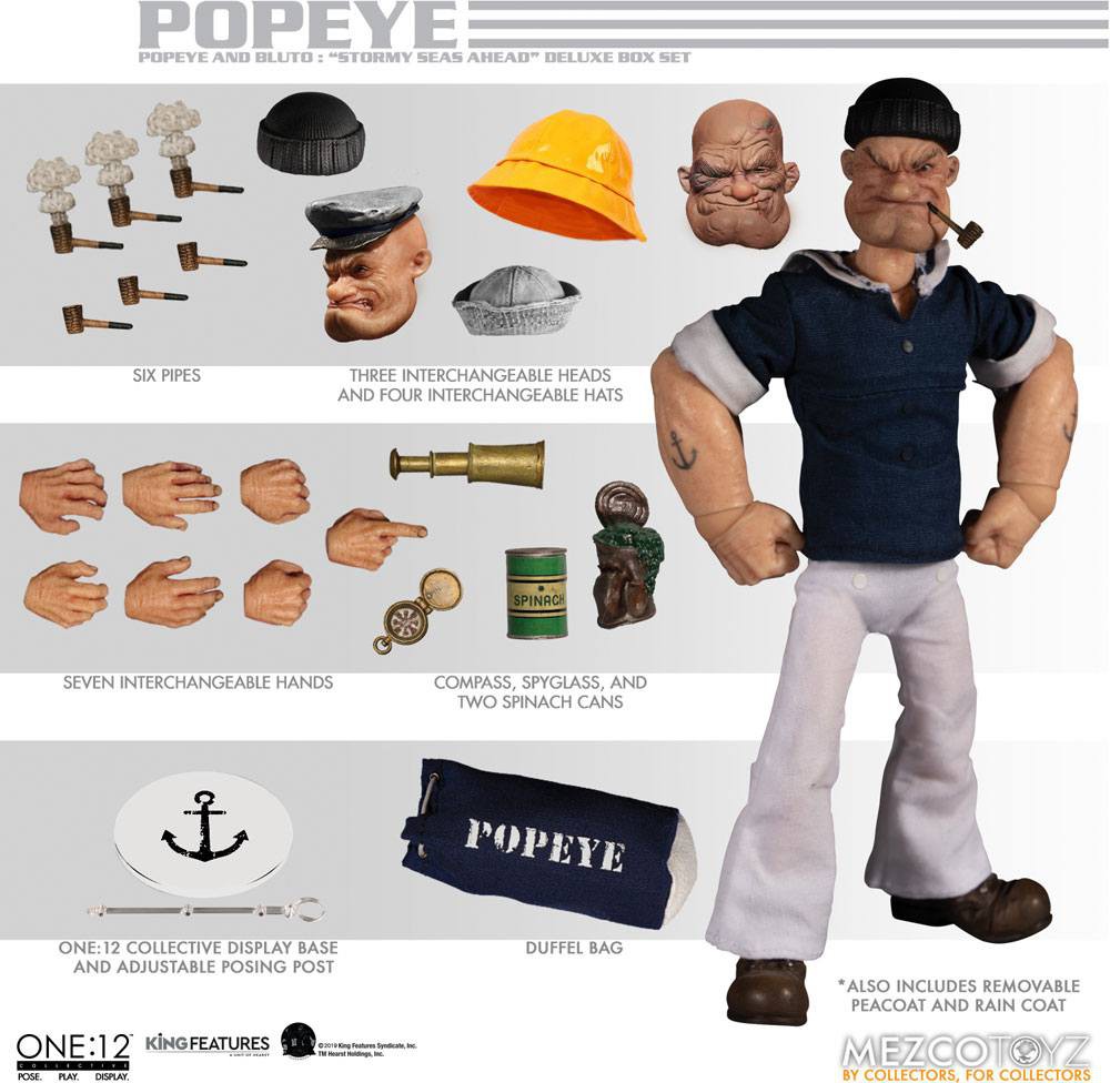 The One:12 Collective Popeye gets a refresh. From his crisp white sailor slacks, to his navy and white trimmed shirt, Popeye looks shipshape and in bristle fashion! Included are three different head portraits: two classic One:12 Collective Popeye options and an all-new roughed-up portrait. Popeye comes complete with a wide range of iconic sailor accessories and outfitting listed below.