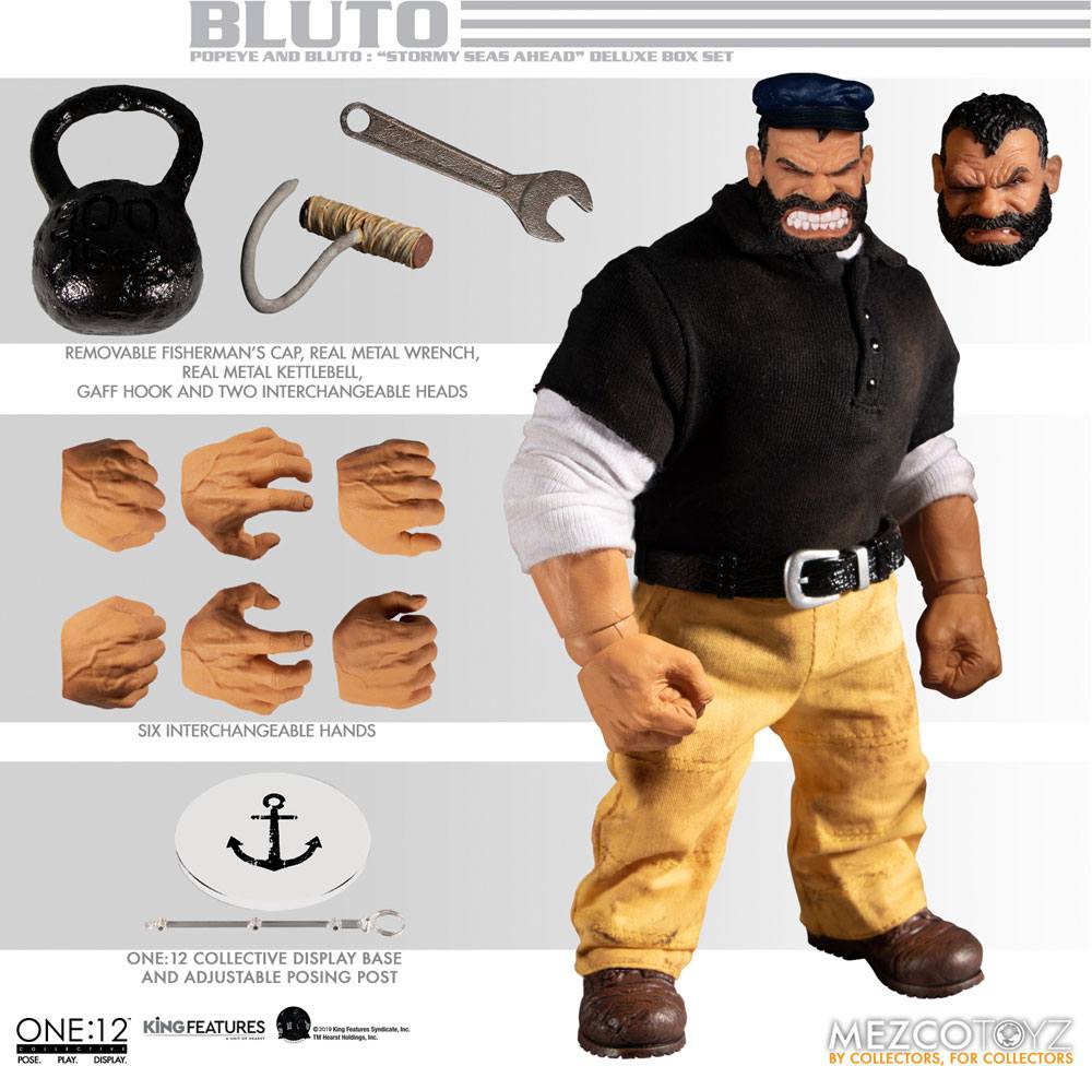 The One:12 Collective Bluto completes the set. Appearing like he has been hanging around the docks and is up to no good, Bluto cuts a choppy wake wearing a collared shirt over a long-sleeve undershirt, work pants, and work boots - all featuring his classic colors. He is packaged with two head portraits displaying varying levels of brawn and brawl. Bluto is well-equipped with some heavy, real metal gear to give his adversary a run for his money.
