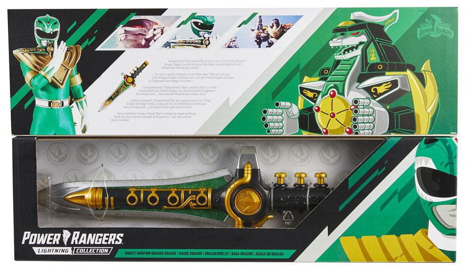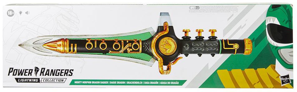 This Lightning Collection Mighty Morphin Green Dragon Dagger collectible features premium paint and decorative details inspired by the show, button-activated light and sound effects, and a stand for display in your collection. Go Go Power Rangers!