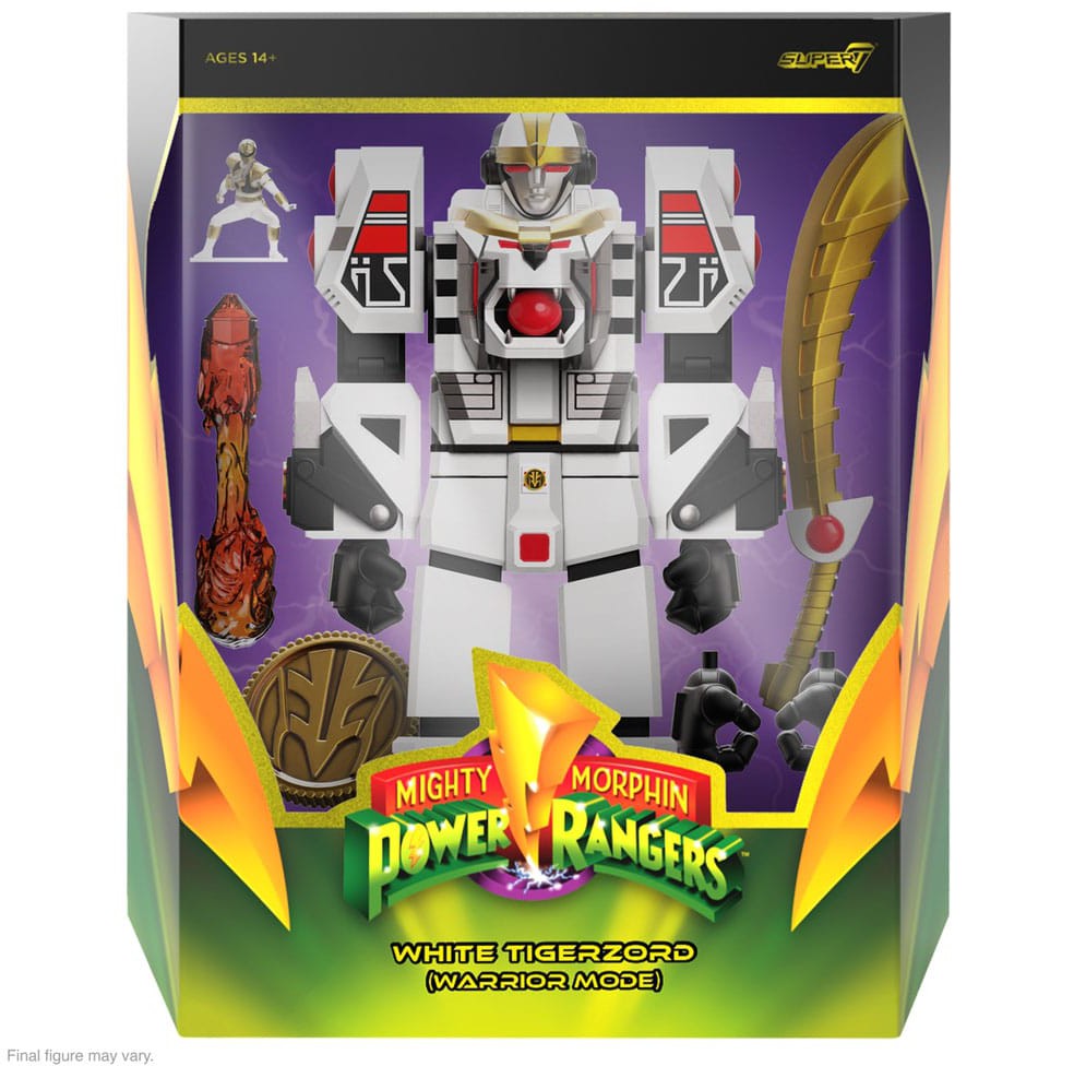 interchangeable hands, his sword, Thunderbolt fireball effect, and Mighty Morphin White Ranger mini-figure. Keep the evil characters in your collection in check with the made-to-order Mighty Morphin Power Rangers ULTIMATES! figure of White Tigerzord in Warrior Mode!