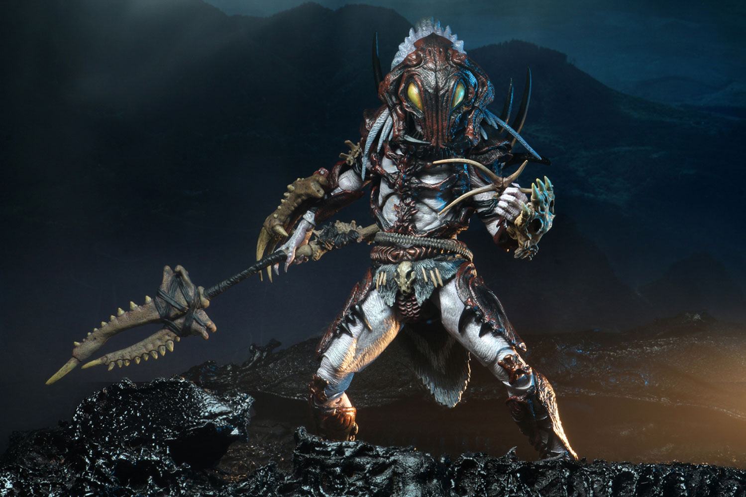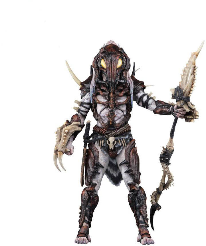 In place of the traditional tech, gadgets, and armor worn by other yautja, the Alpha's attire takes on a more insect-like appearance; a subtle homage to the original 1987 Predator design. Standing 20 cm tall with over 30 points of articulation, the Ultimate Alpha Predator is an entirely new sculpt kitted out with an array of accessories including a removable mask, hook, gauntlets, and 3 pairs of interchangeable hands. Classic Predator weapons such as the wrist blades, staff, and shuriken, have been reimagined to fit his unique theme.