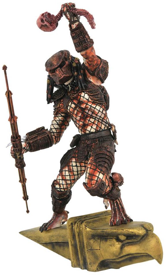 A Diamond Select Toys release! The hunt continues! The Predator line of Gallery Dioramas moves on to Predator 2, capturing that movie's City Hunter in a moment of triumph! Raising a skull and spine over his head, this sculpture of a masked Yautja warrior stands approximately 28 cm tall with detailed sculpting and paint applications. Made of high-quality PVC, it comes packaged in a full-color window box. Designed by Caesar, hand-sculpted by Eli Livingston.
